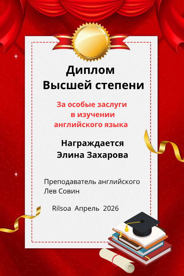 Элина Захарова учится в 7 классе. Занимается на курсах английского в центре SOVINS со 2 класса, то есть учится шестой год. В этом учебном году добилась блестящих результатов. Ее ответы и оценки на каждом уроке 10 баллов. Портал Rilsoa поздравляет Елину Захарову с таким выдающимся результатом и с присуждением Диплома Высшей Степени за особые заслуги в изучении английского языка